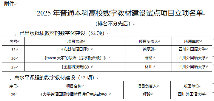 เมื่อเร็วๆ นี้ คณะกรรมการการศึกษาเทศบาลฉงชิ่งได้ประกาศรายชื่อโครงการนำร่องการสร้างตำราเรียนดิจิทัลระดับปริญญาตรี ประจำปี 2025 โดยมีโครงการ 4 โครงการจากมหาวิทยาลัยภาษาต่างประเทศเสฉวน (หรือ ม.SISU) ได้รับการอนุมัติ อาทิ โครงการ "หนังสือเรียนการสื่อสารระหว่างประเทศในภาษาอังกฤษเพื่อบอกเล่าเรื่องราวของฉงชิง"  ตำราเรียนทั้ง 4 เล่มนี้มีความสอดคล้องอย่างใกล้ชิดกับประเด็นสำคัญ 2 ประเด็น คือ "การเสริมพลังดิจิทัล" และ "การรับใช้ท้องถิ่น" โดยมุ่งเน้นไปที่นวัตกรรมสหวิทยาการด้านการสื่อสารระหว่างประเทศและการบูรณาการหลายภาษา เนื้อหาครอบคลุมภาษาอังกฤษ รัสเซีย ภาษาฝรั่งเศส กฎหมาย และเทคโนโลยีทางการเงิน ฯลฯ